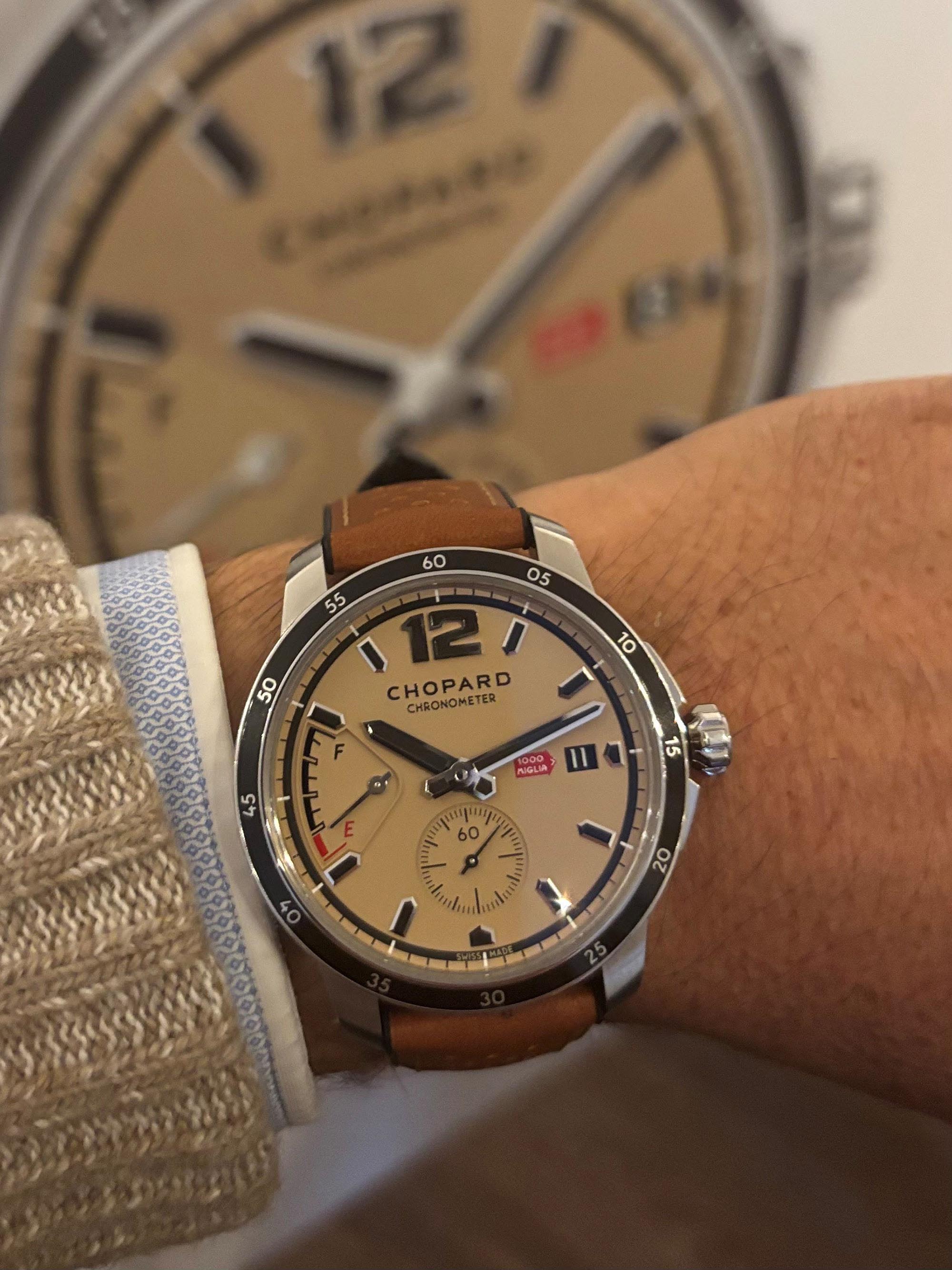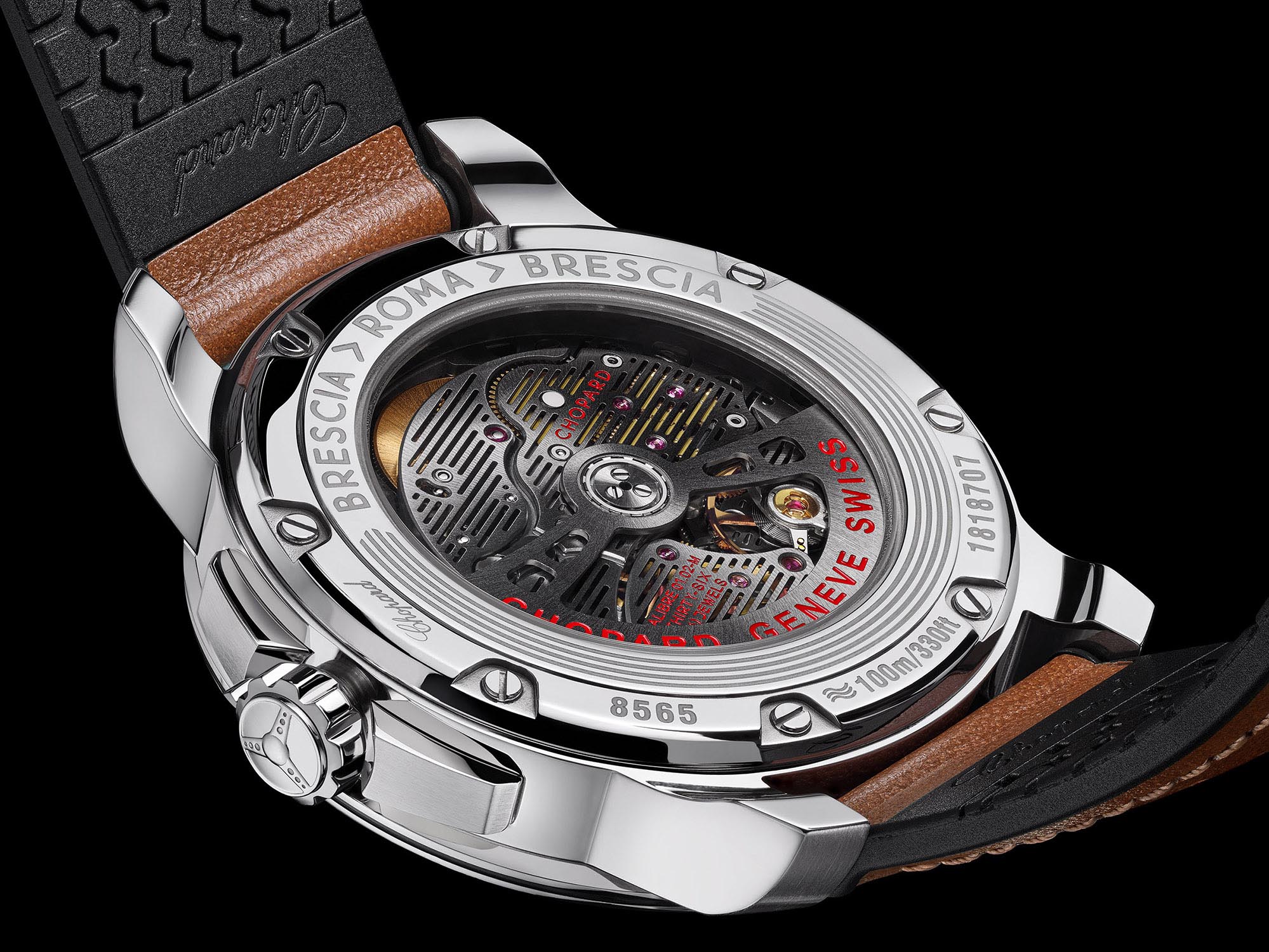Le mouvement automatique certifié COSC se distingue par sa décoration inspirée de l’univers automobile et une réserve de marche de 60 heures. Elle s’affiche sur un indicateur évoquant une jauge de carburant. Les clins d’œil racing se poursuivent sur le bracelet en cuir de veau brun perforé, avec doublure en caoutchouc à finition pneu noir, et sur la couronne vissée gravée d’un volant. Inspiration logique pour la 1000 Miglia, d’autant plus quand la série limitée est réalisée en partenariat avec le Bonmont Motors Club, dont M. Scheufele (coprésident de Chopard) est membre et dont les fondateurs sont passionnés de montres.
